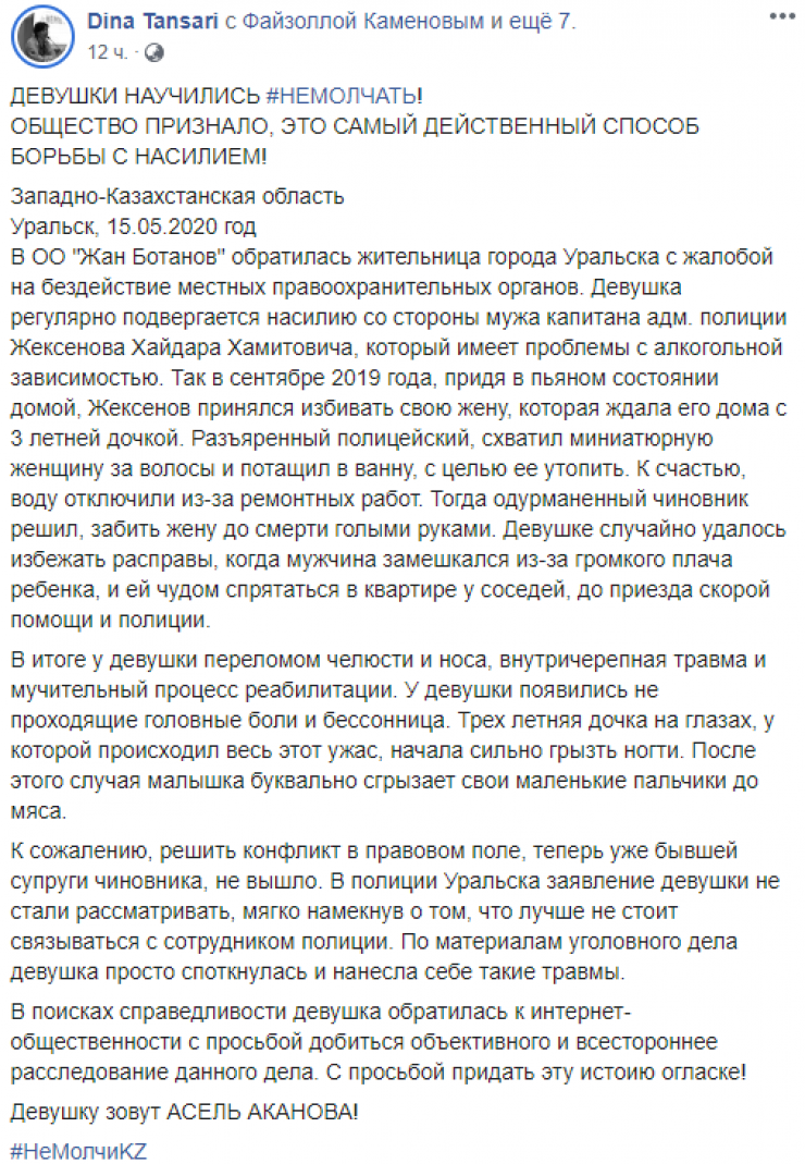 Она отметила, что офицер административной полиции ДП ЗКО Жексенов имеет проблемы с алкоголем. Поводом для публикации в сети стал семейно-бытовой конфликт, который произошел осенью 2019 года. Правозащитница на своей странице утверждает, что полицейский в нетрезвом состоянии избил свою супругу, ждавшую его дома вместе с трехлетней дочерью.