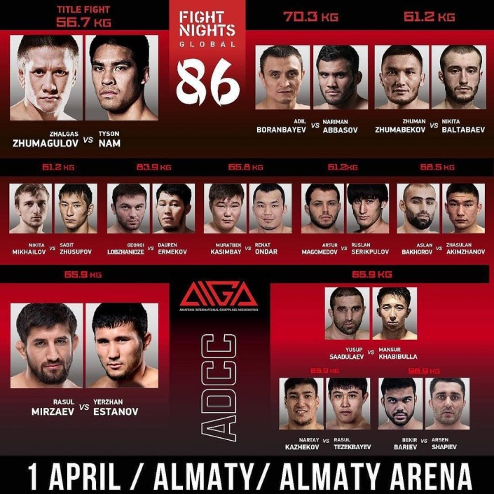 В воскресенье, 1 апреля, в южной столице на "Алматы Арене" состоится престижный международный турнир по ММА- Fight Nights Global 86. В главном бою вечера сойдутся казахстанец Жалгас Жумагулов и американец Тайсон Нэм.