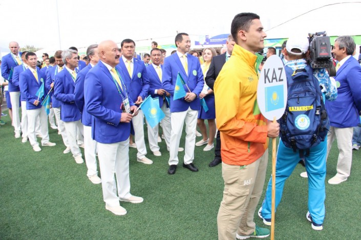 Сама церемония поднятия флага сопровождалась костюмированным представлением в национальном стиле. В настоящее время на игры приехали 50 казахстанских спортсменов из 104. Некоторые команды, например, тяжелоатлеты, прибывают на турнир группами.