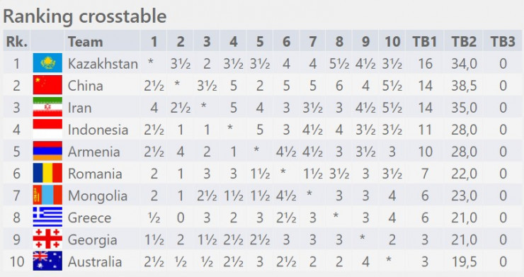 В заключительном, девятом, туре группового этапа Казахстан обыграл Монголию со счетом 4:2, а Китай проиграл Армении с таким же счетом. Бибисара Асаубаева выиграла очередной свой матч на турнире, который стал для нее седьмым.