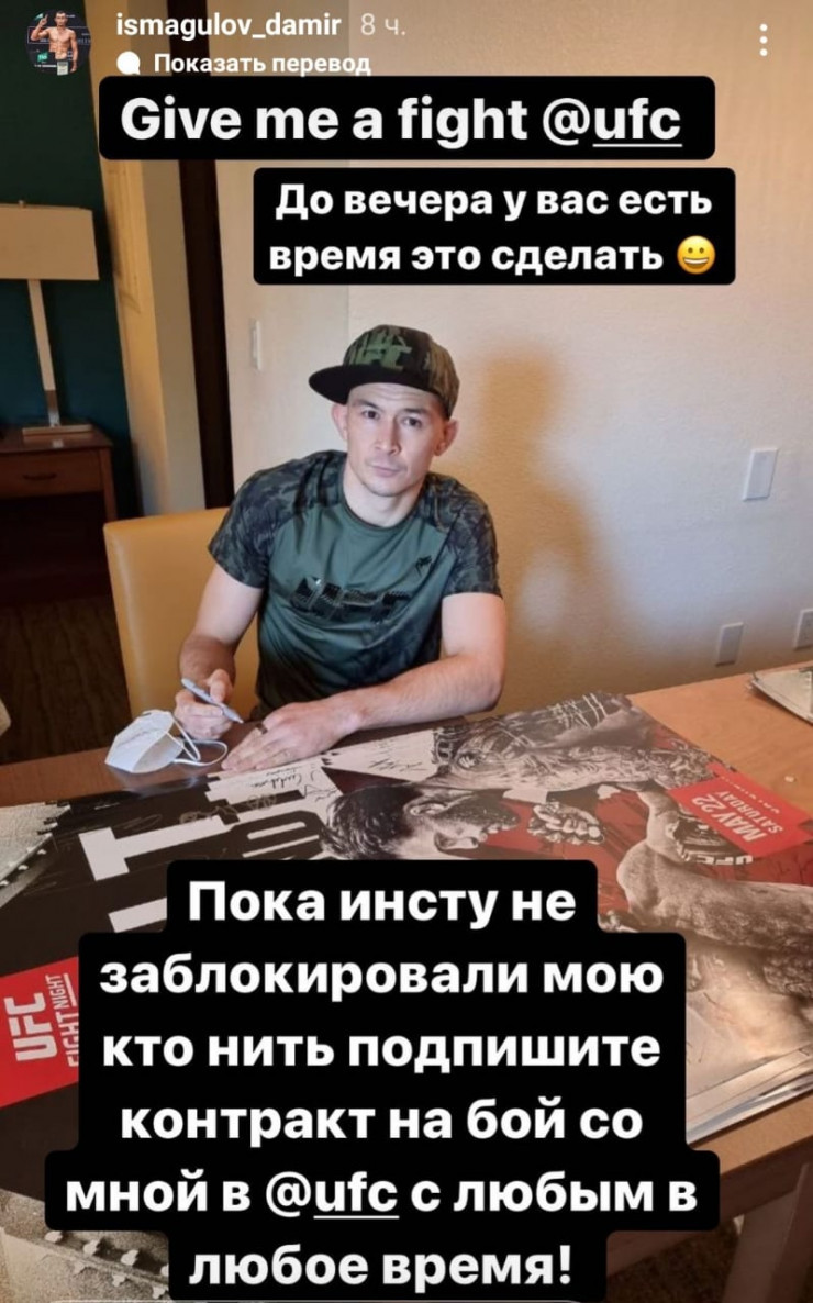 Казахстанский боец UFC Дамир Исмагулов (23-1) опубликовал пост в Instagram Stories, сообщают Vesti.kz, передает Tengrinews.kz.