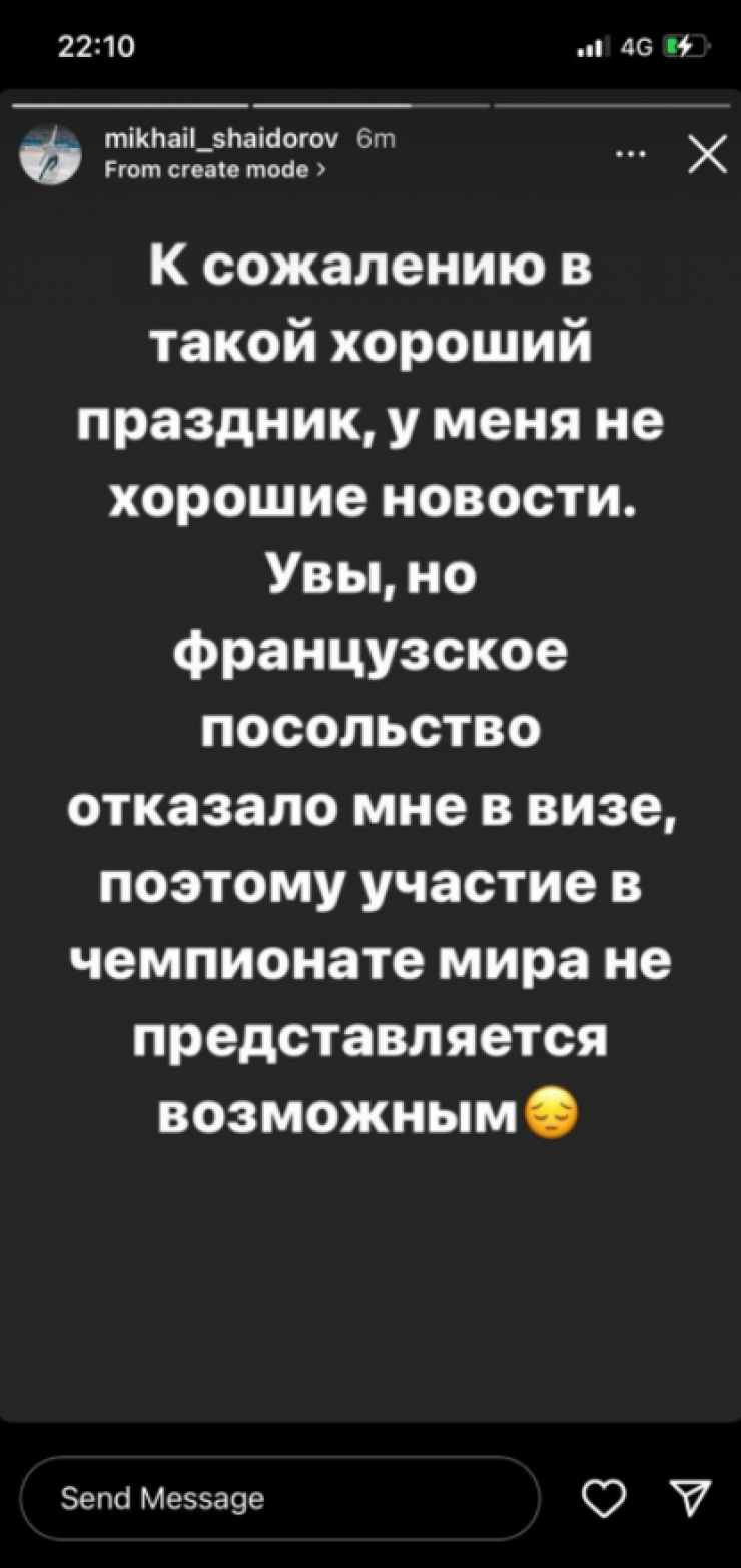 Шайдоров был в списке участников в мужском одиночном катании, однако французское посольство отказало казахстанцу в визе. Об этом сам спортсмен написал на своей странице в Instagram. Причину отказа в визе он не уточнил.