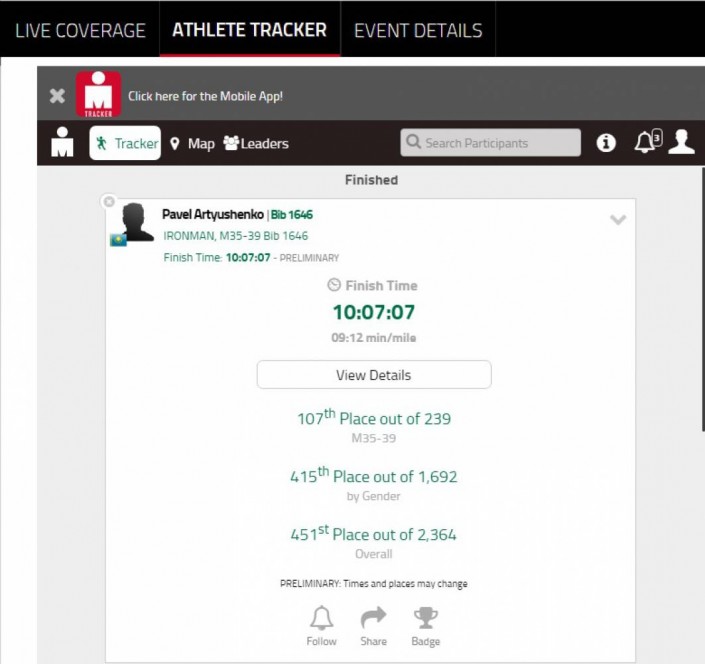 Лучшее время показал Артюшенко, который в возрастной категории 35-39 лет стал 107 из 239 участников. Его итоговое время составило 10 часов 7 минут 7 секунд.