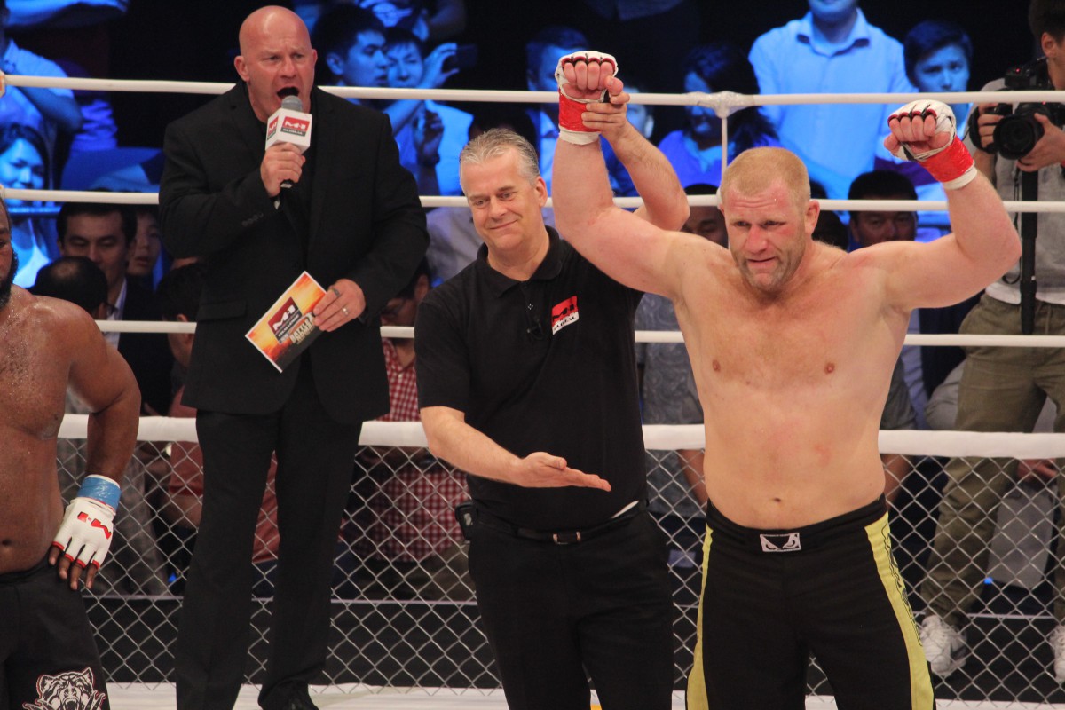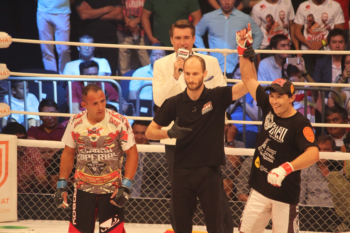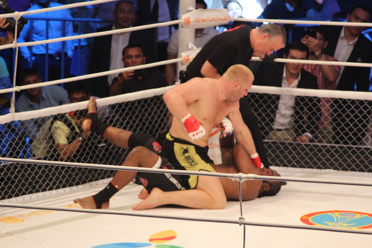 В главном бою вечера сошлись звезды ММА первой величины - россиянин Сергей Харитонов и американец Кенни Гарнер. В ноябре 2014 года эти титулованные супертяжеловесы уже встречались в Пекине и тогда победу отдали Харитонову (поединок был остановлен досрочно из-за рассечения у американца). В Астане россиянин вновь одержал победу, записав на свой счет технический нокаут.
