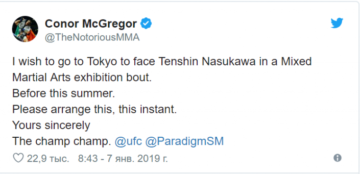 "Я хочу поехать в Токио и сразиться с Тенсином Нацукавой в рамках выставочного боя по правилам ММА. До этого лета. Пожалуйста, договоритесь об этом. С уважением, чемпион", - написал Конор.