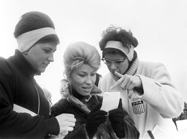 Клара Гусева (в центре) со своими американскими подругами следит за ходом соревнований на IX зимних Олимпийских играх 1964 года в Инсбруке. © РИА Новости/ Юрий Сомов
