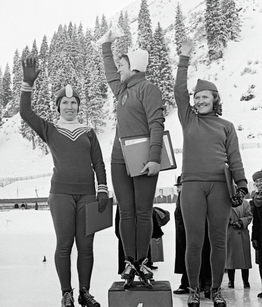 Победительницы соревнований на Первенство СССР 1960 года по скоростному бегу на коньках среди женщин (слева направо): Клара Гусева, Тамара Рылова, Лидия Скобликова на пьедестале почета на высокогорном катке близ Алматы. © РИА Новости/ Иосиф Будневич