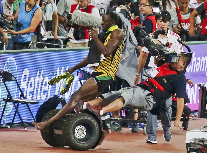 После победы в забеге на 200 метров Болт шел по беговой дорожке стадиона, за ним ехал оператор на сегвее. Потеряв управление самокатом, журналист упал и сбил спортсмена с ног.