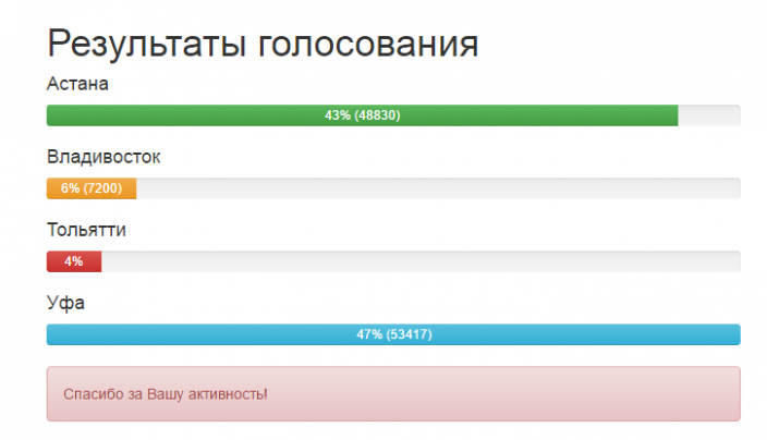 По состоянию на 12 часов по времени Астаны за казахстанскую столицу проголосовало 48 830 интернет-пользователей, за Уфу - 53 417 пользователей. Таким образом, Астана отстает от Уфы на 4587 голосов.