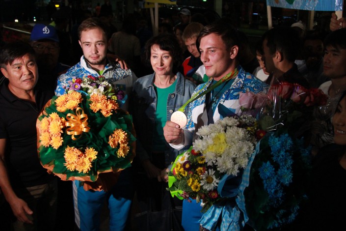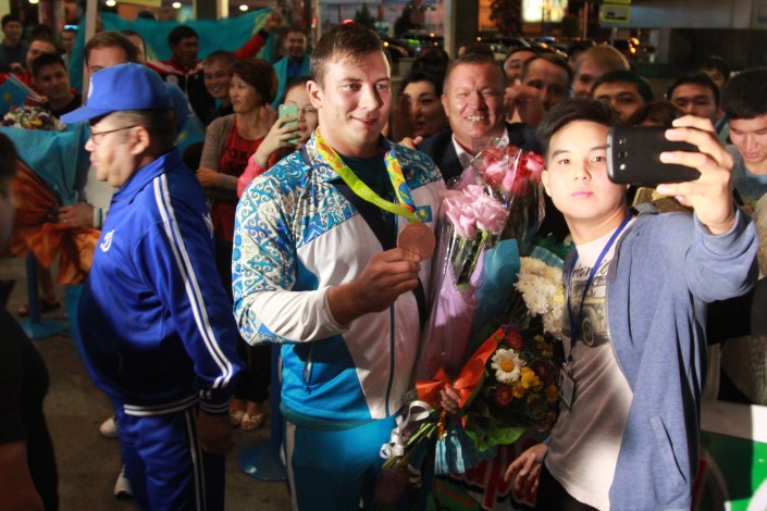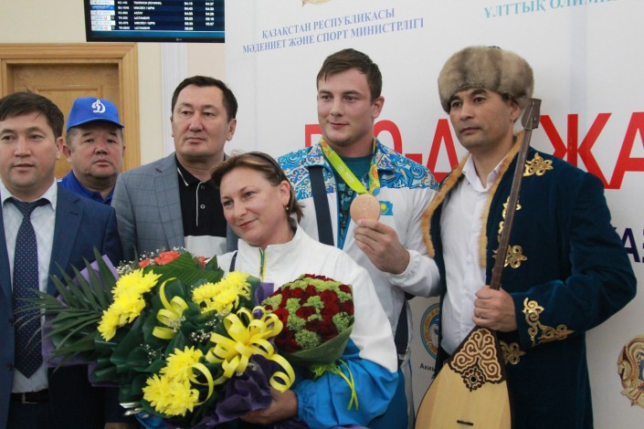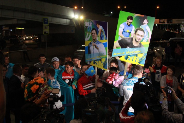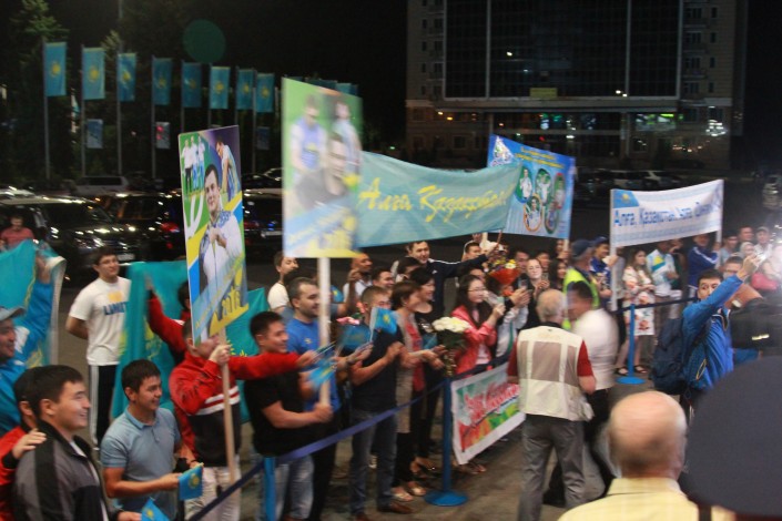 На улице спортсменов ждали болельщики. Подняв транспаранты и цветы, они скандировали имена казахстанских олимпийцев.
