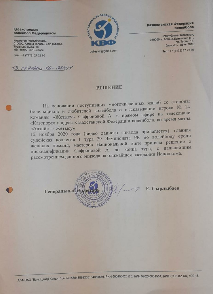"На основании поступивших многочисленных жалоб со стороны болельщиков и любителей волейбола о высказывании игрока № 14 команды "Жетысу" Алеси Сафроновой в прямом эфире на телеканале QazSport в адрес казахстанской федерации волейбола во время матча "Алтай" - "Жетысу".