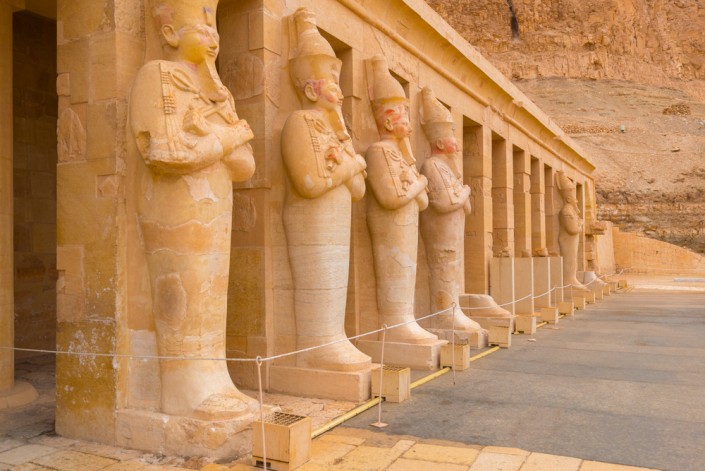 На строительство заупокойного храма Хатшепсут, которое началось еще при ее жизни, ушло девять лет. Его вырубили прямо в основании отвесных скал Дейр эль-Бахри. Строение составляют три разноуровневых террасы, соединенных пандусами – когда-то на них были пруды и росли деревья с тропическими растениями. Храм украшало огромное количество скульптур, а также рельефы и фрески, рассказывающие о жизни и деяниях самой правительницы, включая сцены о снаряженной ею экспедиции в страну Пунт, организованных ею строительных работах и военных парадах, а также изображения древнеегипетских богов.
