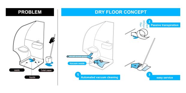 2. Airbus предлагает создать самоочищающиеся туалеты. Новая концепция называется "сухой пол" и представляет собой вакуумную систему, установленную в нижней части унитаза. Она всасывает все пролитые жидкости и грязь с пола. Ведь, наверное, мало кому из пассажиров хочется убирать за собой, учитывая, насколько эти кабинки тесны.