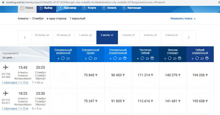 Казахстанские авиакомпании на своих сайтах также предлагают билеты за границу. Авиакомпания SCAT организует с июня рейсы в Стамбул, Прагу, Баку, Тбилиси.