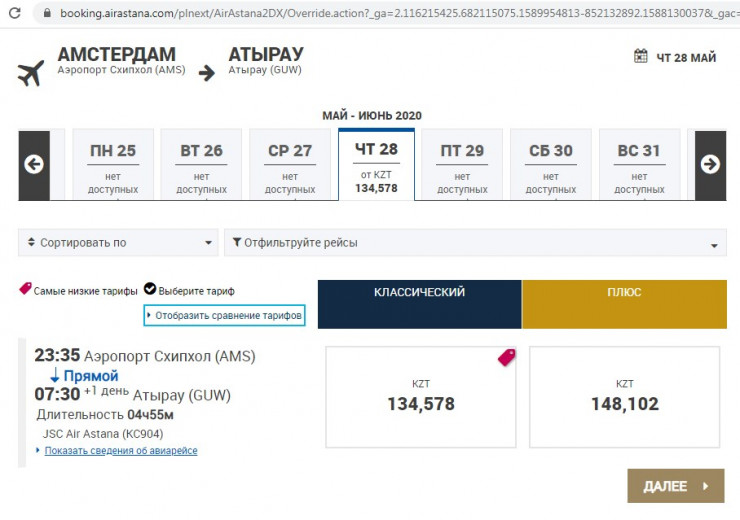 На сайте авиакомпании "Эйр Астана" сообщается, что для граждан Казахстана, находящихся в Амстердаме и Франкфурте, будет осуществлен рейс из Франкфурта в Уральск 27 мая 2020 года. Стоимость билета составит от 152 800 тенге. Также предлагаются два рейса из Амстердама в Атырау 21 и 28 мая 2020 года по цене от 135 700 тенге.