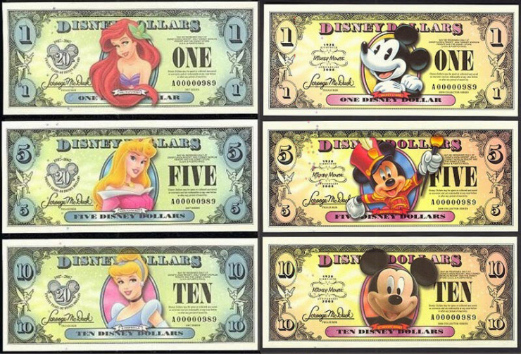 Кто-то скажет, что таких "денег" было полно и в странах бывшего СНГ в магазинах приколов. Но это не совсем одно и то же. Диснеевскими долларами реально можно расплатиться, хоть и выглядят они крайне несерьезно (на купюрах в 1, 5, 10, 50 долларов изображены Микки и Минни Маус, Плуто, Гуфи и другие, сами знаете чьи, персонажи). Эту "валюту" принимают в тематических парках, специализированных магазинах и на лайнерах корпорации Disney в США.