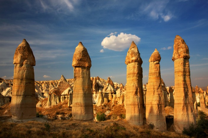 Очень интересное название из-за скал необычной формы, которые в ней расположены, принадлежит еще одной долине – "Долине ведьминых труб". Много веков назад здесь произошло извержение трех вулканов одновременно, и лава заполнила долину. Благодаря этому сегодня мы можем наблюдать фантастический вид – высокие скалы-столбы, на вершинах которых огромные камни, напоминавшие шляпы грибов. Поскольку столбы имеют фаллическую форму, эту долину Каппадокии также называют Долиной любви.