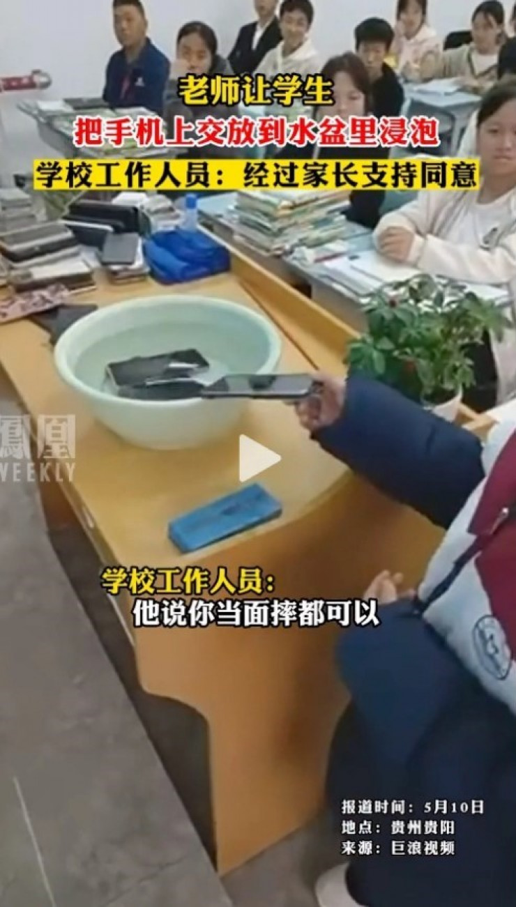 Видео экстремального способа наказания непослушных детей разместило издание South China Morning Post. На нем учитель средней школы заставляет учеников погружать свои мобильные устройства в бассейн с водой. На видеоролике горка мобильных телефонов размещена на школьной парте рядом с тазом с водой и видно, как учащиеся кладут в него свои телефоны один за другим.
