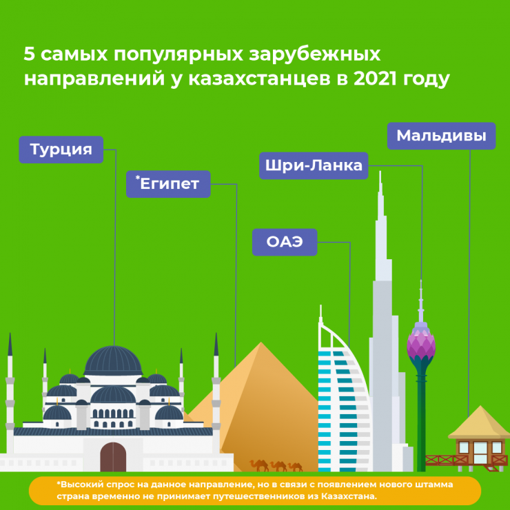 Самыми популярными зарубежными направлениями для казахстанцев в 2021 году стали Египет (высокий спрос на данное направление, но в связи с появлением нового штамма Казахстан временно ограничил выезд путешественников из Казахстана в Египет), ОАЭ, Мальдивы, Шри-Ланка, Турция.