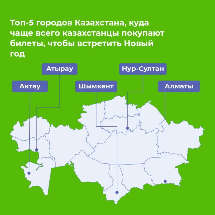 Топ-5 городов Казахстана, куда чаще всего казахстанцы покупают билеты, чтобы встретить Новый год, – это Нур-Султан, Алматы, Шымкент, Актау, Атырау.