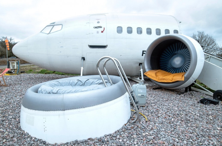 Передняя половина авиалайнера 737-й модели рассчитана на четырех человек: есть двуспальная кровать в грузовом отсеке и гидромассажная ванна в старом кожухе реактивного двигателя.