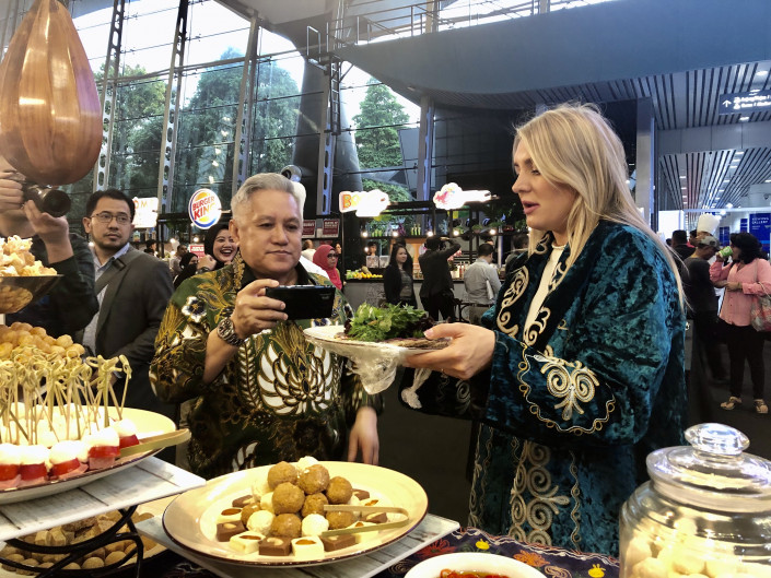Казахскую кухню на фестивале MIGF KULinary (Malaysia International Gastronomy Festival) представила известная сеть ресторанов Parmigiano Group, которая при поддержке авиакомпании "Эйр Астана" привезла из Казахстана основные деликатесы нашей кухни: курт, жент, халву, ежегей, шубат, кумыс, казы, баурсаки… вместе с оборудованием и прочей кухонной утварью это более 600 килограммов!