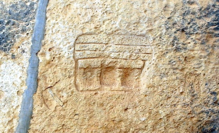 Древний петроглиф из Мнайдры с изображением святилища с крышей.