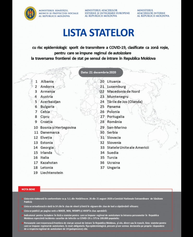 Министерство здоровья, труда и социальной защиты Республики Молдова обновило список стран, гражданам которых запрещен въезд, передает Tengritravel.kz со ссылкой на ведомство. В "красный" список попали 37 государств, в том числе и Казахстан.