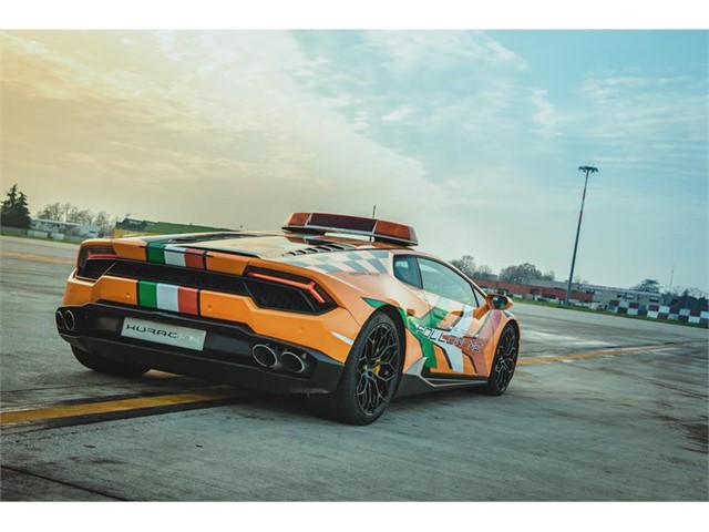 Служебный суперкар с призывом "Follow Me" - "Следуй за мной" в ярко-оранжевом окрасе имеет стробоскопы на крыше, черные квадратные шашечки на капоте и радио, чтобы связываться с диспетчерской службой аэропорта. Дизайн автомобиля, который создан сотрудниками центра стиля компании, повторяет цвета итальянского флага.
