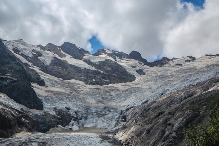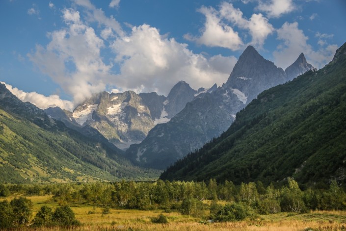 С одной стороны – склоны горы Мусса-Ачитара, с другой – отвесные стены массива Джугутурлучат, а впереди – холодные и грозные вершины Домбай-Ульген и Птыш. Мурашки по коже – то ли от влажного ветра, то ли от прохладной одежды, то ли от оглушительной тишины. Интуиция кричит: "Обернись!", и мы медленно, очень медленно, оглядываемся назад. Там пока еще беззвучно, но от этого не менее зловеще: тяжелая свинцовая туча подбирается все ближе к нам.