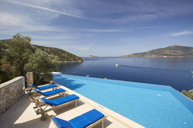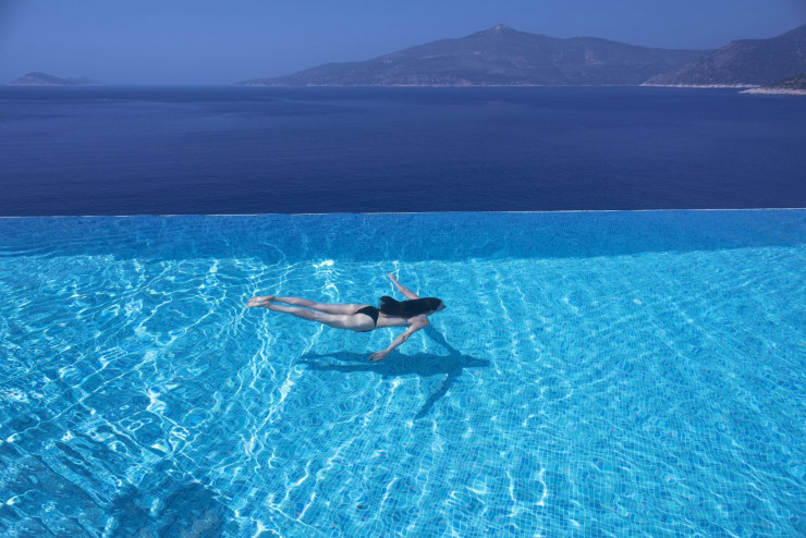 На склоне соснового холма на юго-западе Турции, на Ликийском побережье, в отеле Villa Mahal можно найти прекрасный бесконечный пейзажный бассейн. Из 17-метрового бассейна открывается вид на море и на липовые, оливковые и фиговые деревья, растущие вокруг отеля.