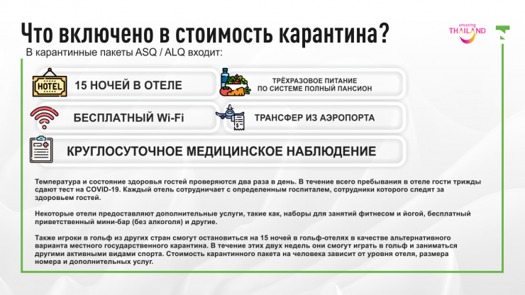 Вторым немаловажным условием, которое туристам необходимо соблюдать при въезде в Таиланд, является прохождение обязательного 16-дневного карантина. Власти Таиланда утвердили для прохождения карантина отели в Бангкоке (ASQ - alternative state quarantine) и в других провинциях Таиланда - Пхукете, Паттайе, Прачанбури (ALQ - alternative local quarantine). В каком из отелей вы остановитесь, зависит от города прилета. После прохождения карантина туристы могут абсолютно свободно перемещаться по стране. Забронировать отели можно на сайтах asq.locanation.com, asq.ascendtravel.com и agoda.com.