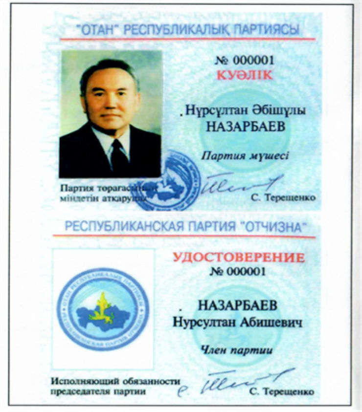 Копия удостоверения члена РПП "Отан" Назарбаева, 1999 год