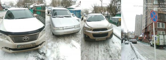 Житель Астаны заметил, что вдоль дома № 52 по улице Кенесары трое водителей 16 февраля оставили автомобили под знаком запрета парковки. Знак расположен на улице Дулати.
