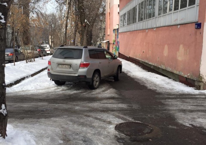 Парковку перед подъездом зафиксировали 17 февраля в одном из алматинских дворов.