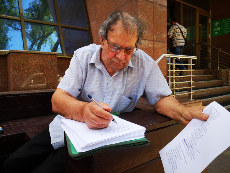 Этот интеллигентного вида человек - поэт и писатель Олег Дмитриевич Рябуха. Впрочем, себя он называет коллекционером профессий: чем он только не занимался в прошлом. Перед тем как выйти на пенсию, он 17 лет проработал учителем русского языка и литературы в алматинских школах.