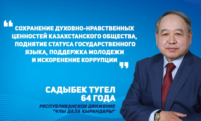 Садыбек Тугел - кандидат в президенты от республиканского движения "Ұлы дала қырандары". Родился в Восточно-Казахстанской области, у него двое детей. Окончил факультет журналистики Казахского государственного университета имени Кирова. Работал заведующим отделом Сената Парламента. Занимался творческой и общественной деятельностью. Является вице-президентом Федерации национальных видов конного спорта.