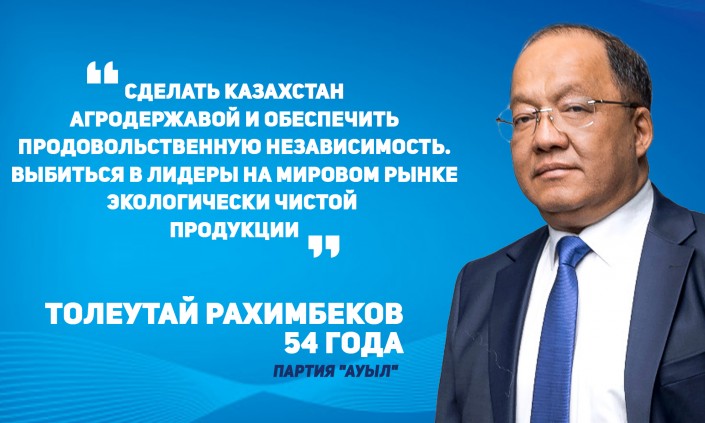 "В целях развития аграрной науки нами будут разработаны и внедрены действенные механизмы взаимодействия аграрного бизнеса с учеными, инструменты распространения ресурсосберегающих, инновационных и климатических зеленых технологий возделывания сельскохозяйственных культур, геномной селекции крупного рогатого скота, а также биологические методы защиты растений", - говорится в предвыборной программе Толеутая Рахимбекова.