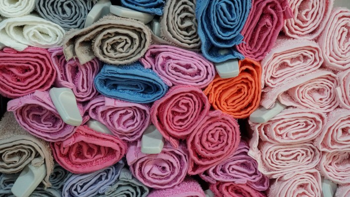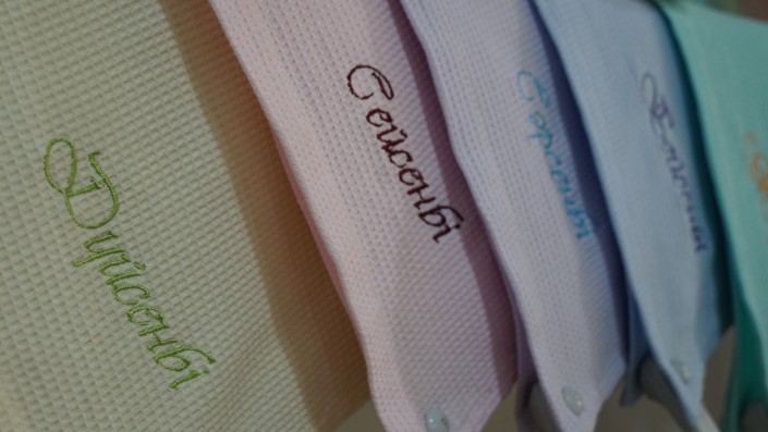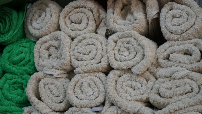 "Вот большое банное полотенце, произведенное компанией из Шымкента. Оно стоит 1800 тенге, я дома пользуюсь таким же, оно изготовлено из 100-процентного хлопка, выращенного в Казахстане. У него очень хорошая впитываемость, оно не линяет, сохраняет свою окраску при многочисленных стирках. Импортные аналоги таких банных полотенец стоят 2400-4200 тенге, при этом впитываемость у них оставляет желать лучшего, поскольку в импортные аналоги стали в последнее время чаще включать синтетические волокна", - говорит  управляющий магазином.
