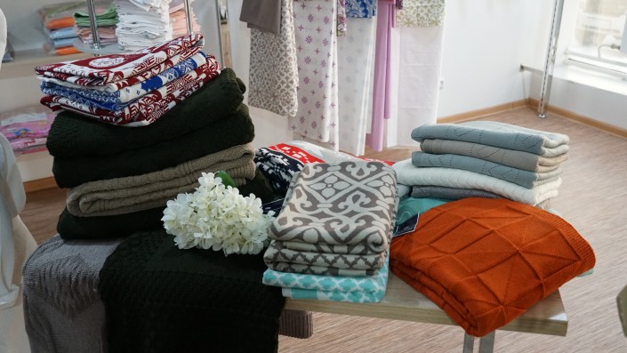 "Посмотрите, вот эти полюбившиеся покупателям пледы изготовлены из мягкой полушерстяной пряжи. Средняя цена таких пледов, в зависимости от размеров и дизайна, колеблется в пределах от 9 до 16 тысяч тенге. Если сравнить их с импортными аналогами, то там цены будут порядка 25-40 тысяч тенге и выше, причем чаще всего это синтетика. Отечественные производители изготавливают свою продукцию, как правило, из натурального экологически чистого сырья - шерсти и 100-процентного хлопка", - отмечает Гайния Кусаинова.