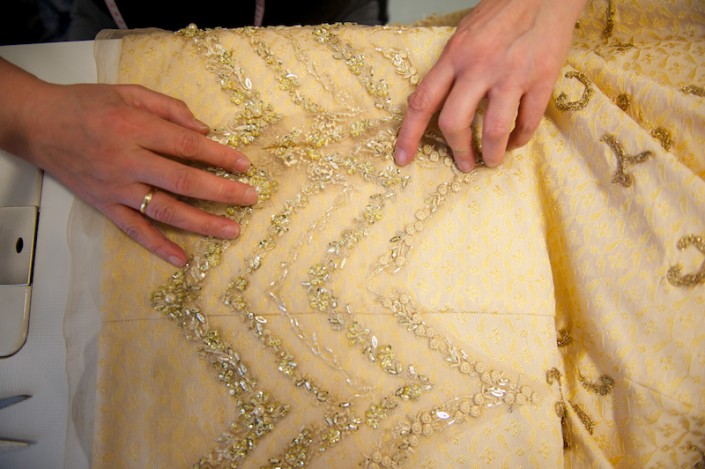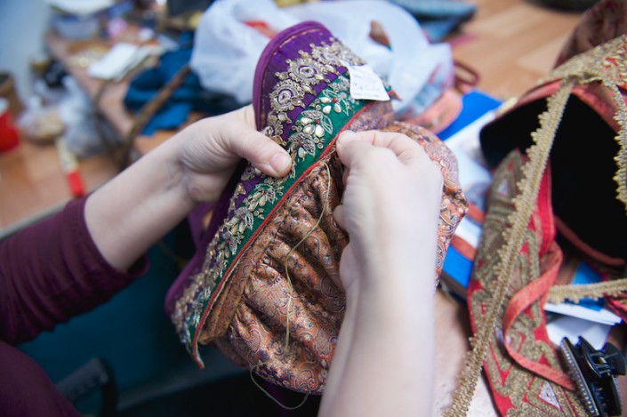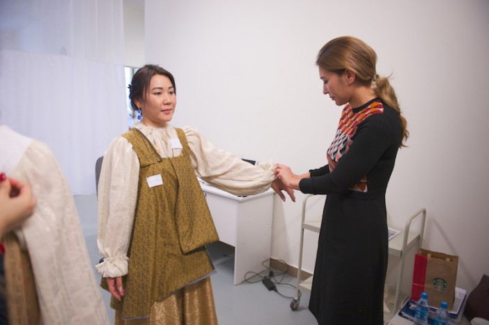 "Достаточно представить себе классические пушкинские времена, чтобы понять, в каком стиле выдержан спектакль. Начинается все достаточно просто: фасоны, отделка костюмов соответствуют сцене в саду, более пышные, нарядные, богатые и сложные костюмы можно будет увидеть в сценах именин Татьяны и греминского бала, для пошива костюмов этой сцены мы покрасили 300 метров органзы в разные оттенки синего. При этом необходимо было не потерять легкость, воздушность, так как сам цвет достаточно "тяжелый". Одним из моих любимых костюмов стало платье замужней Татьяны. В нем отражено глубокое душевное состояние героини. Впрочем, каждый характер персонажа, его возраст и социальный статус будут достаточно четко читаться в костюмах. К примеру, кокетливая, легкомысленная Ольга будет одета в достаточно яркие платья. Все женские костюмы объединены общей чертой - многослойность и большой объем. Кроме того, практически все платья отделаны вручную", - рассказывает Софья Тасмагамбетова.