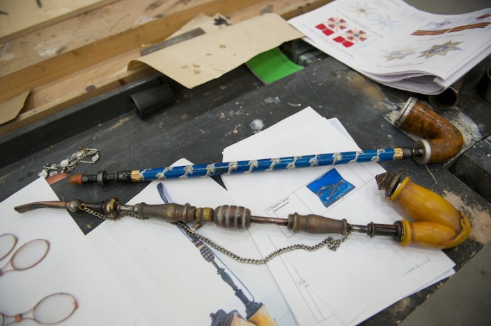 Женщины-мастера создают романтичные веера с кружевной отделкой, дамские сумочки, корзины для вязания, бокалы из пластика, которые совсем нельзя отличить от хрустальных. Мужчины-бутафоры делают канделябры, курительные трубки, трости, подносы, кулоны для часов и, конечно, револьверы для дуэли…