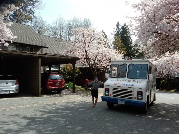 "У владельца пять подобных грузовичков, и мы ездим по всему Ванкуверу. Утром и днем по предприятиям, а потом до заката солнца разъезжаем по небольшим улицам, расположенным вдали от супермаркетов.