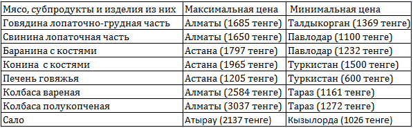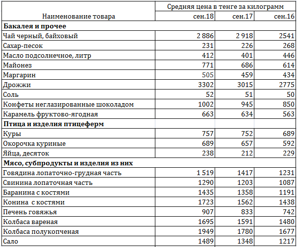 Таблица 4. Стоимость мясной продукции в сентябре 2018 года. Данные: Комитет по статистике МНЭ РК