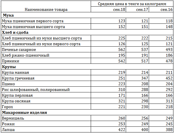 Таблица 2. Стоимость круп в сентябре 2018 года. Данные: Комитет по статистике МНЭ РК