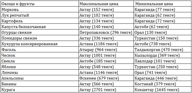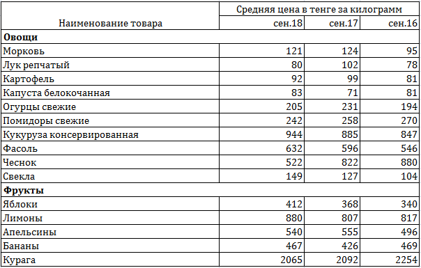 Таблица 8. Стоимость фруктов и овощей в сентябре 2018 года Данные: Комитет по статистике МНЭ РК
