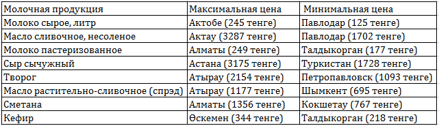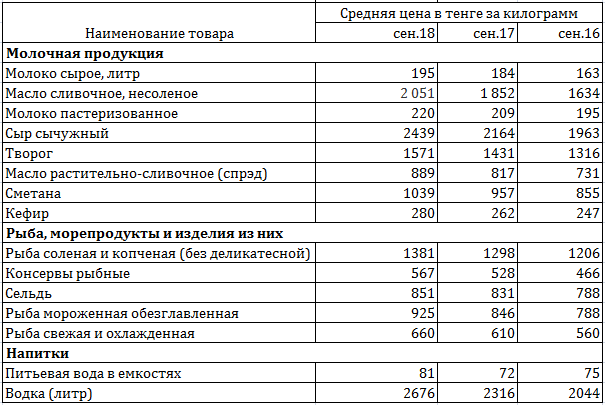 Таблица 6. Стоимость молочной продукции в сентябре 2018 года. Данные: Комитет по статистике МНЭ РК