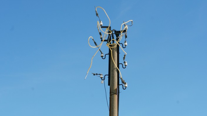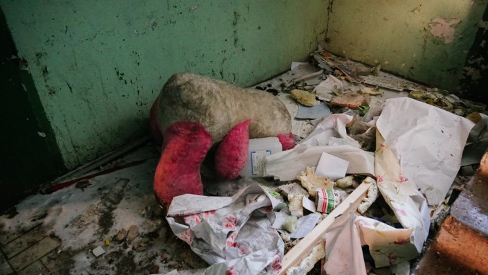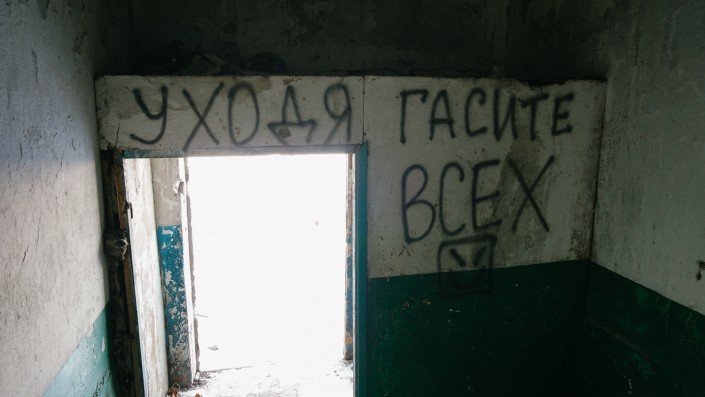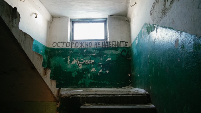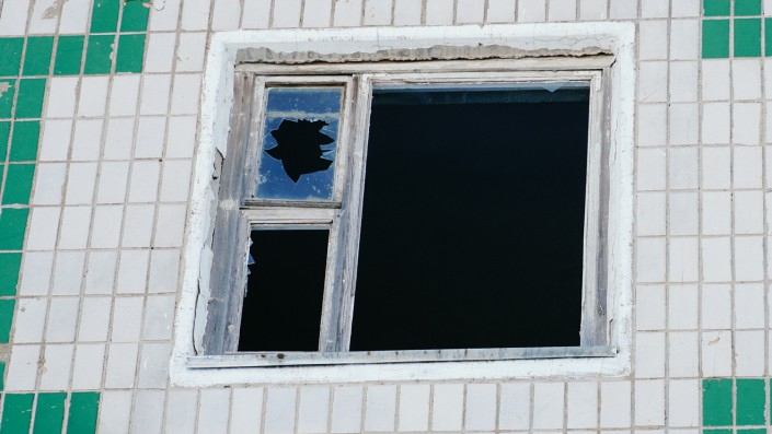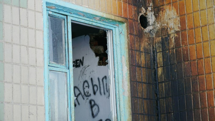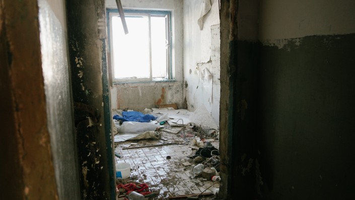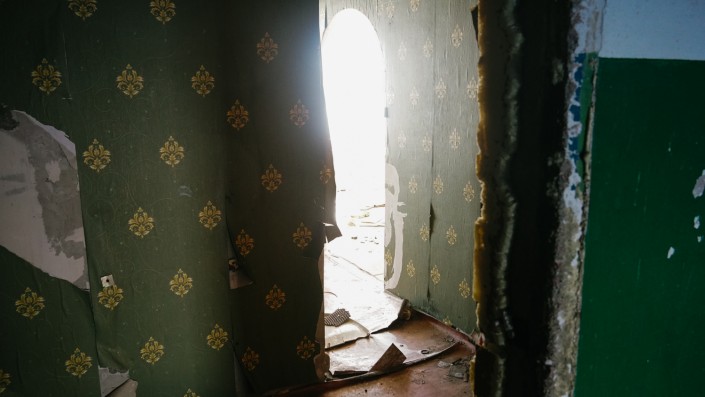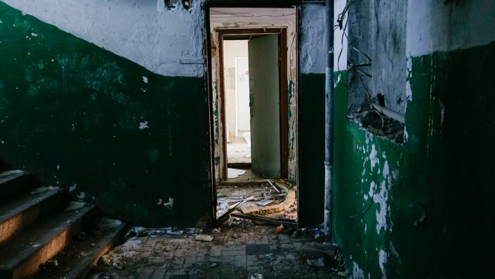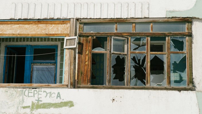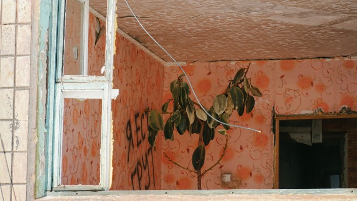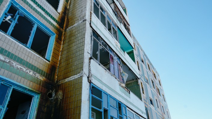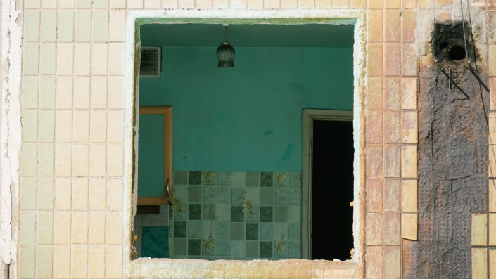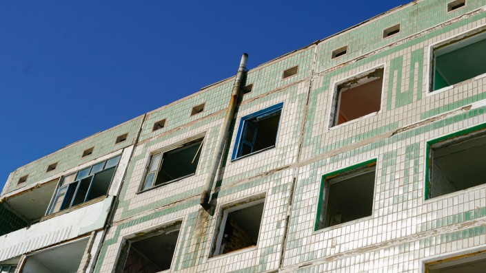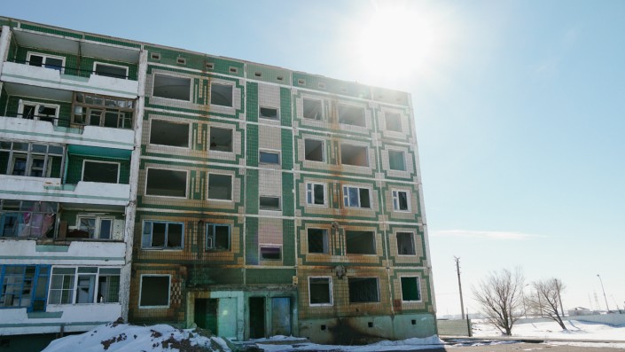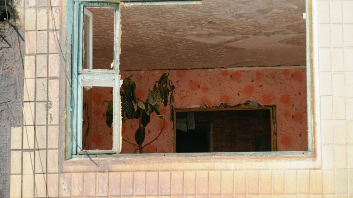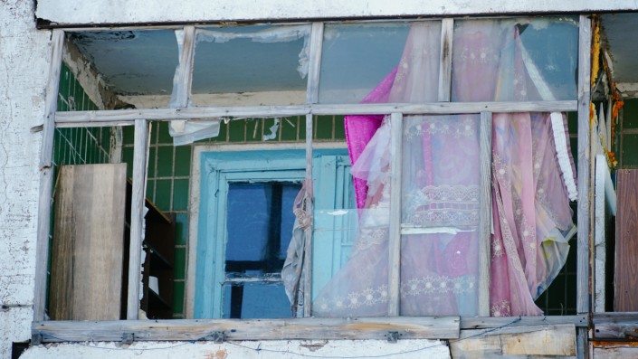 Завывает ветер. Окна в квартирах разбиты. Дверей нет. С балкона развеваются остатки штор.