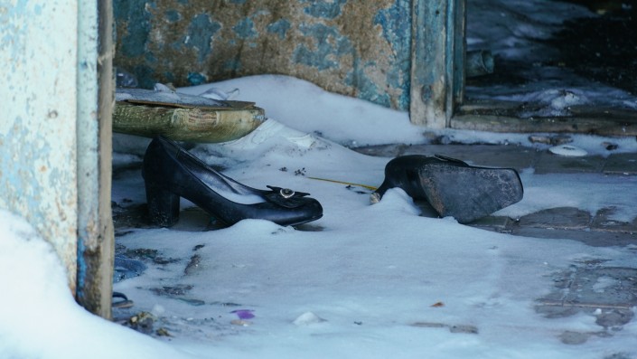 Вход в подъезд запорошен снегом. Заходим внутрь. Кем-то оставленная старая обувь.