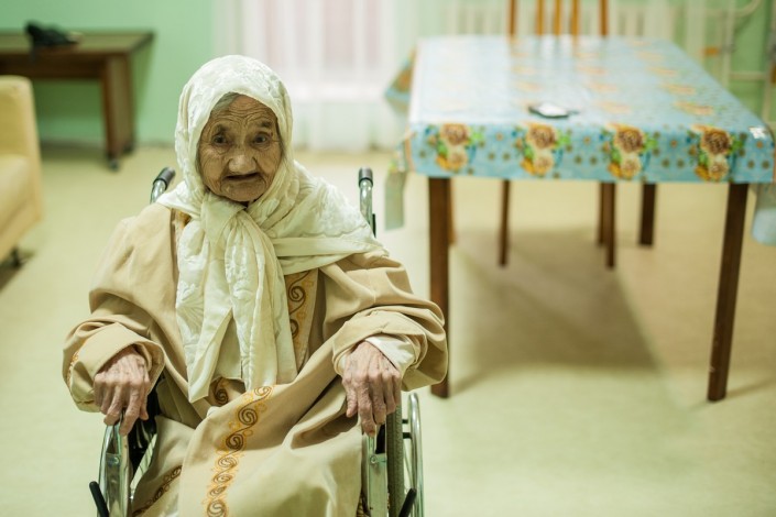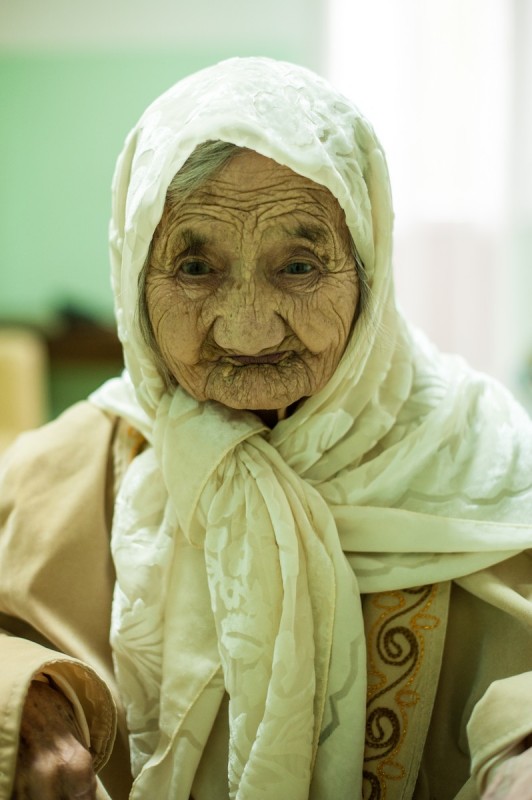 В прошлом году мы также рассказывали о местной долгожительнице Марфуге Есеновой. Сейчас ей 102 года. У женщины есть дочь, тоже уже пенсионерка, ей - 78. В силу возраста и инвалидности дочери содержание в доме престарелых ее матери бесплатное. Однако, как нам рассказали сотрудники персонала, родственники каждое утро навещают Есенову, но забрать к себе ее не могут - не позволяют жилищные условия. В прошлый раз на вопрос о том, как она себя чувствует, Марфуга спела нам песню. На этот раз настроения петь у нее уже не было. Вместо этого она попросила нас жестом присесть и дала свое бата.